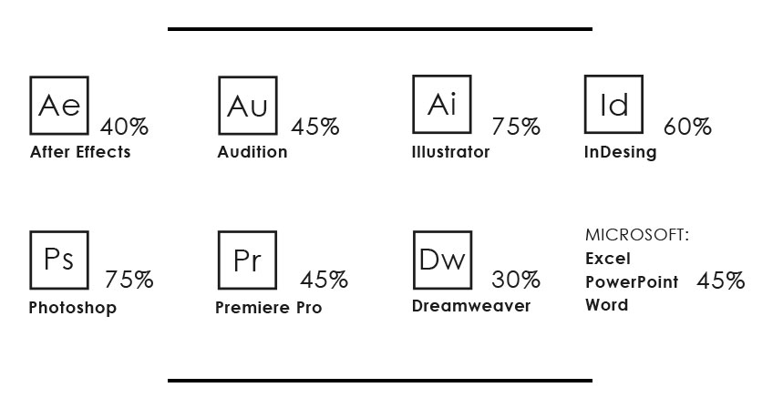 Aquí podrás encontrar en lo que se a dedicado en diferentes áreas de diseño donde ella se inspiró en sus identidad propia, una de las herramientas fundamentales a lo largo de este camino ha sido la Papelería Abode, (Illustrator, Photoshop, InDesing, Premiere Pro, After effects, Audition y Dreamweaver) estos programas le han permitido expresar, experimentar y plasmar sus ideas sin ningún límite, pero tampoco podemos dejar de lado los fundamentos y técnicas iniciales de esta Licenciatura, donde también abarca las técnicas de representación como (Acuarela, acrílicos, gis pastel y lápices de colores) como también fotografía, retoque de imagen, producción y edición de video y audio.